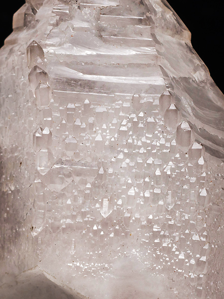 一方、その集合形が一つの大きな単晶形としてまとまっているのだから、成長のより以前の段階では一個の単晶形から概形が育っていったと考えられる。一回性の結晶成長は過飽和度の高い段階から平衡に近い段階に進んで、最終的に整った一様な結晶面をもたらすのがセオリーだが、この標本の場合はむしろ終末期に過飽和度の高い段階が現れたのだろう。