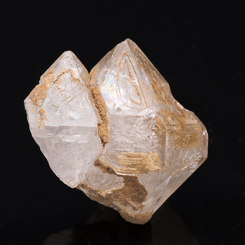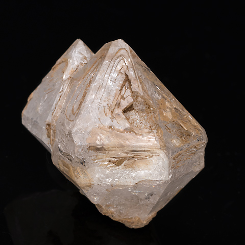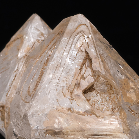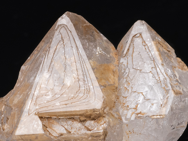 このページの標本はごく軽度の骸晶形態を持つもので、枠の段差は肉眼的であるが、かなり浅い。錘面は内側が窪み傾向だが、一見して一様な結晶面に見えるほどである。平坦な結晶面は成長丘から外周に広がってゆく成長機構によって作られるのが一般的だとしても、外枠から内側が堤道の幅を広げるように埋まっていく機構もありうる、それを示すのがこの標本ではないか、と考える。