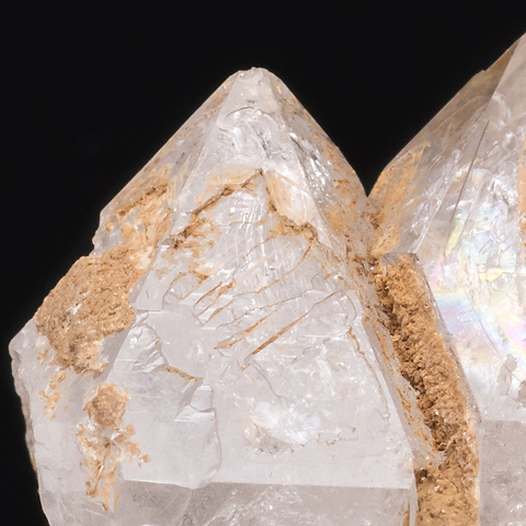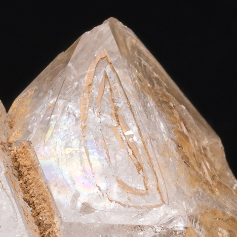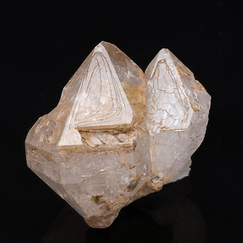 No.961は窓面のよく整ったフェンスター・タイプのエレスチャル水晶で、いわゆる骸晶形を持つ。No.1045は骸晶的錘面が階段状に伸び、頭部から見るとまるで三連貫入双晶のような形が見られる。こうした錘面は内側が窪み、しばしば「の」の字、あるいは「ム」の字といいたい明瞭な模様(段差)を描く特徴がある。単純な「窓枠」(フェンスター)が生じる場合もあるが、多くはその堤の一ケ所が破れていたり、等高面(というより堤道)が内側に巻き込んでいるのだ。
