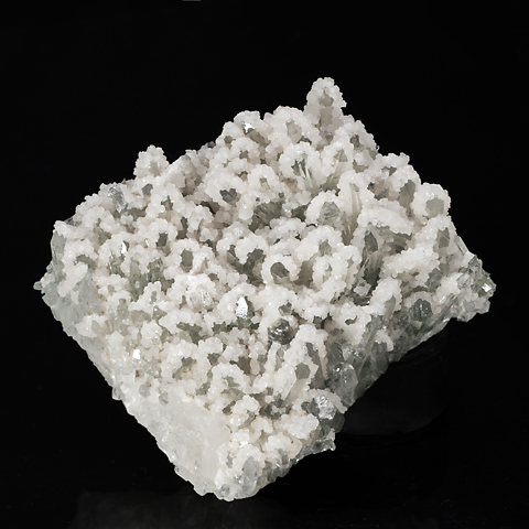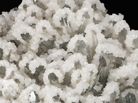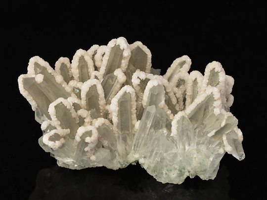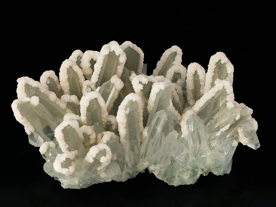 さて、このページの標本2点は水晶の群晶を方解石の微晶が覆ったものだが、群晶は半面だけが覆われ、残りの面には付加を生じていない。覆われた部位はどの単晶も同じ方位であり、おそらくは重力の作用した方向にのみ付着が起こったとみられる。言い換えれば、群晶を浸している溶液中に新しく生じた方解石の粒子が、沈降してその先で受け皿となる面上(ないしすでに沈着した方解石上)に蓄積されたと想定出来る。