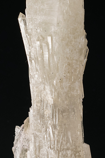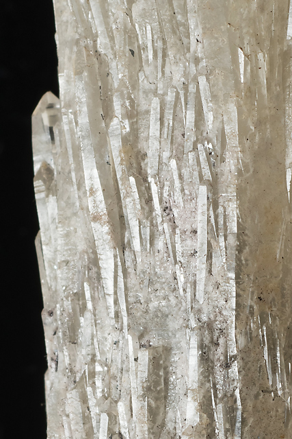 このページの標本はその類例だが、付着する微小単晶形が比較的長い柱面を持っている。そして局所的に微小形の上にさらに微小形が積み上がって、全体形が発散するように広がっている。一番下の画像の左側に注目すると、主たる大きな単晶形の柱面が左上に反り返っていることが分かる。これは微小形の集積が全体の秩序に統合されて広い一体面を形成しているのだ。こうした機構で全体形の面が形成されると、いわゆるロケット形(涙滴形)やアーティチョーク形、つぼみ形と呼ばれる形態に発展すると思われる。