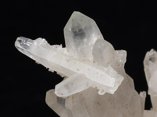 No.1049の発散形の類例(発展形)。No.1050との違いは錐面に笠形の付着がないこと、及び亜平行モードでない、平行形から大きく外れた角度での交差形及び二次(二世代)成長形が随伴していることだ。交差はいかにも思わせぶりで、日本式双晶(傾軸十字接合)(同じくマダン産)や鳥形三連晶を想起させる。凹入角を測ってみると、正規の 84.5度からは数度の誤差があるのだが、そもそも発散型の亜平行連晶が母体であってみれば、このレベルのズレもまた双晶接合において許容範囲なのではないかと思えてくる。