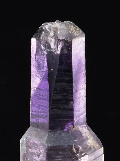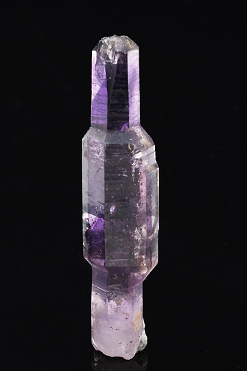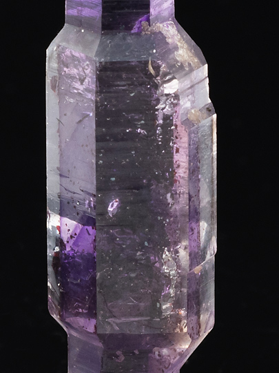 全体的に淡い紫色に着色したアメシストで、サヤ部の上下に濃淡境界が見られる。画像では判りにくいが、境界面はほぼ柱面を渉る一方向傾斜になっている(ししおどしの竹の先端のような)。サヤ部の上の境界面と下の境界面とは平行的だ。ということは柱の細い部分はほぼそのような形の一方に偏って発達した錐面を持ち続けて成長し、最後になって頭の山形錐面が形成されたのだろう(あいにく標本では割れているが)。