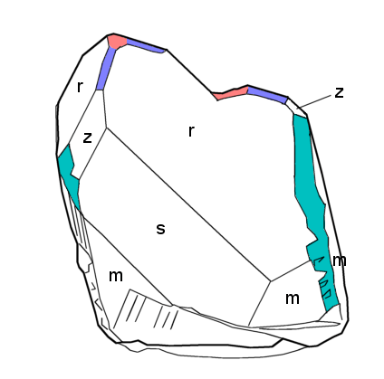 1.主要3面:r面(主錘面/正菱面体面)、z面(副錘面/負菱面体面)、m面(柱面)