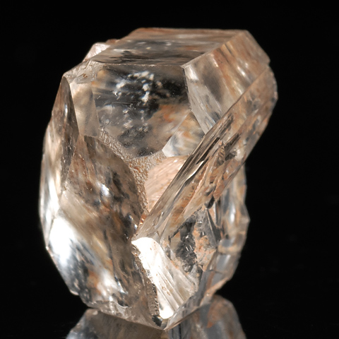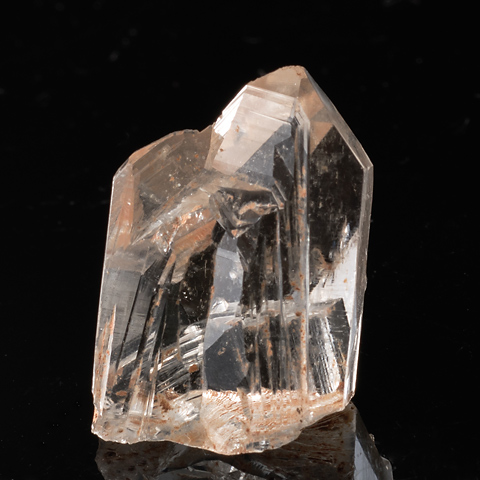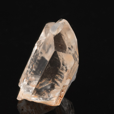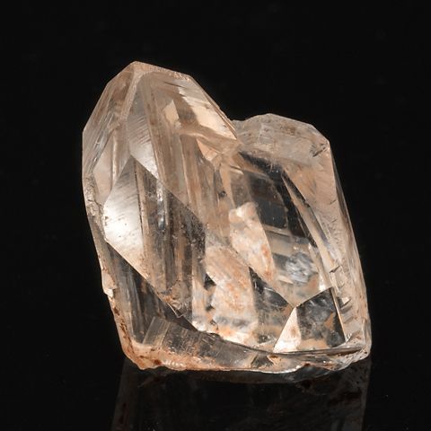 錐面の頭頂部に平坦面、またその周辺に緩傾斜面を伴う紫水晶を No.1055と No.1056に示した。単純な成長作用に加えて溶食作用が働いて生じたと考えられる。これらはレアな結晶面だが、普通の無色透明の水晶にも例があるので、米国アーカンソー州産を紹介する。この土地の産状は No.49で触れたが、熱水性の水晶が大量に出ることでつとに有名で、溶食を伴わない単晶は No.134のようにきわめて美しい結晶面・稜線を持つ。一方、 No.969、 No.986 に溶食の痕跡を示す標本を示したが、大傾斜面やレアな「肩の微小面」も見られる。