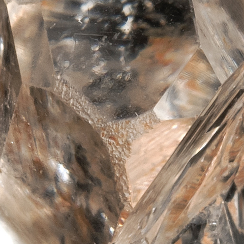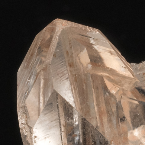 このページの標本はまた趣きを違え、メジャーな 3結晶面(r, z, m面)は平滑で光沢に富み、しかし本来の稜線部には溶食によって生じたとみられるラフな凹凸部/擬似面や、縦(柱軸)方向の条線が発達している。錐面の頭部付近に粗い擬似面がある。詳細は各画像にコメントしたが、補足すると緩傾斜面と柱軸との挟角は 54.5度、57度、63度、と三方でそれぞれ違っている。ちなみに 'π面 (0112)の理想挟角は 57.6度、'D面 (0225)は 63度、'ω面 (0113)は 67度だ。