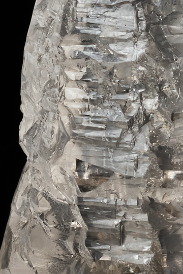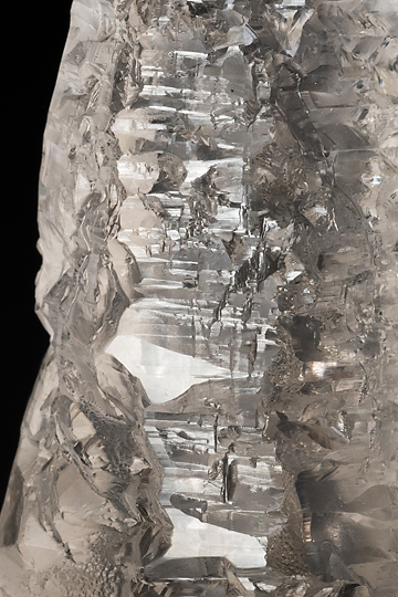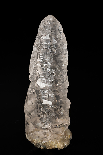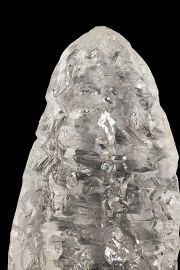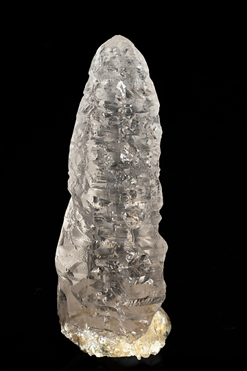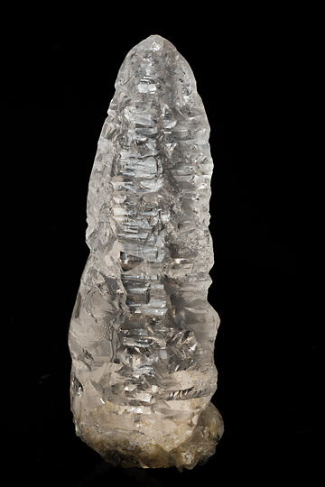No.1056のアメトリンに似た形状の無色透明の水晶で、激しい溶食を受けた様子が窺えるもの。アイシクル(つらら:氷柱)と愛称されるタイプだ。透明度が高く、内部にほとんどキズがない高品質の結晶なので、光を受けて美しく輝いてみえる。元はあったと思しい安定成長時の錐面や柱面は概ね頻繁に繰り返される凹凸面に置き換わっている。凹凸面のいくつかは錐面や柱面と等価のようだが、その他にこれらとは異なる角度で傾斜した擬似面が多数生じている。