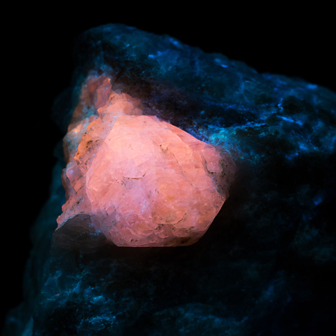 ハックマン石は方ソーダ石の亜種で、ライラック〜紫色のものを言う。すでに繰り返し書いているが、可逆的感光性(Tenebrescenece)があり、外光に曝すと見る見る色が褪せてゆき、紫外線にあてると、あんず色に蛍光しながら、もとの色を回復する。で、この標本もやっぱりその性質を示すので、なるほどなあ…と納得した。持ち帰った時は半透明の白い結晶だったが、5分ほど紫外線に当てると、写真よりちょっと濃いくらいの紫になった。嬉しいのは、黄白色の、かなり強い燐光が観察出来ることで、これも私的に意表を衝かれ、マル。いつまで経っても知らないことは山ほどある。