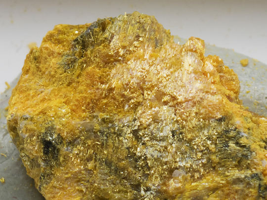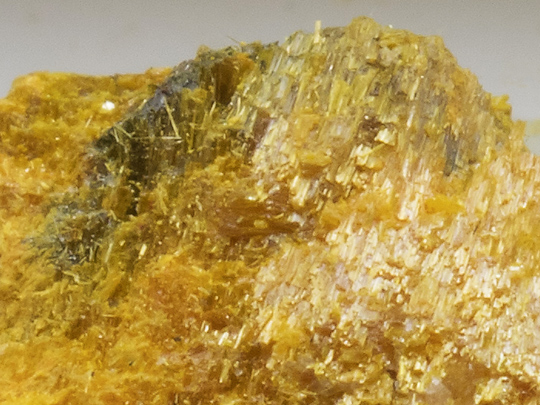 その経緯について私は詳らかにしないが、もともと黄色針状の鉱物を石黄としていた人たちは針状の石黄があってもおかしくないと考えたのだろうし、また別の人たちは、この産状で石黄が針状を示すのはおかしいと考えたのかもしれない。