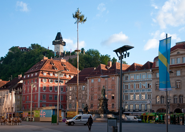グラーツ旧市街 広場からシュロスベルクの時計塔を望む。