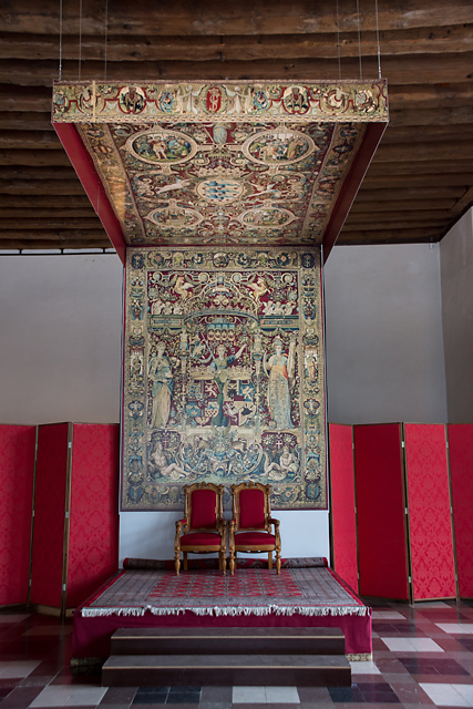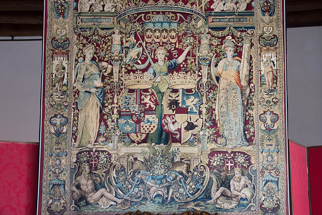 タペストリーに描かれた 5人の女性は、優れた君主の 5つの美徳、節度(左)、正義(中央)、強さ(右)、慈悲(左端)、慎ましさ(右端)を象徴。