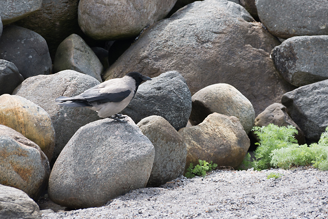 海峡縁りの石積み。コクマルガラスがいた。